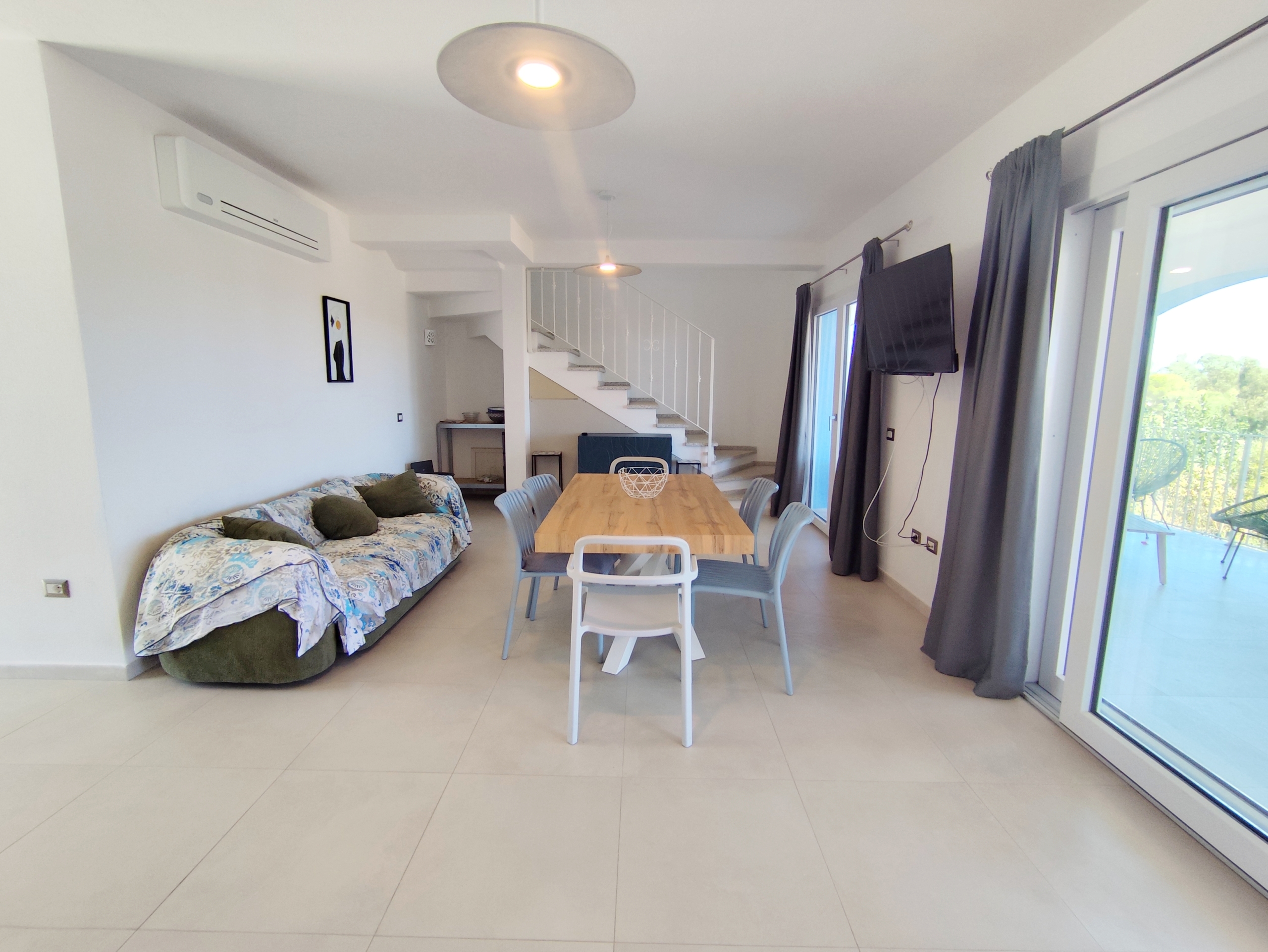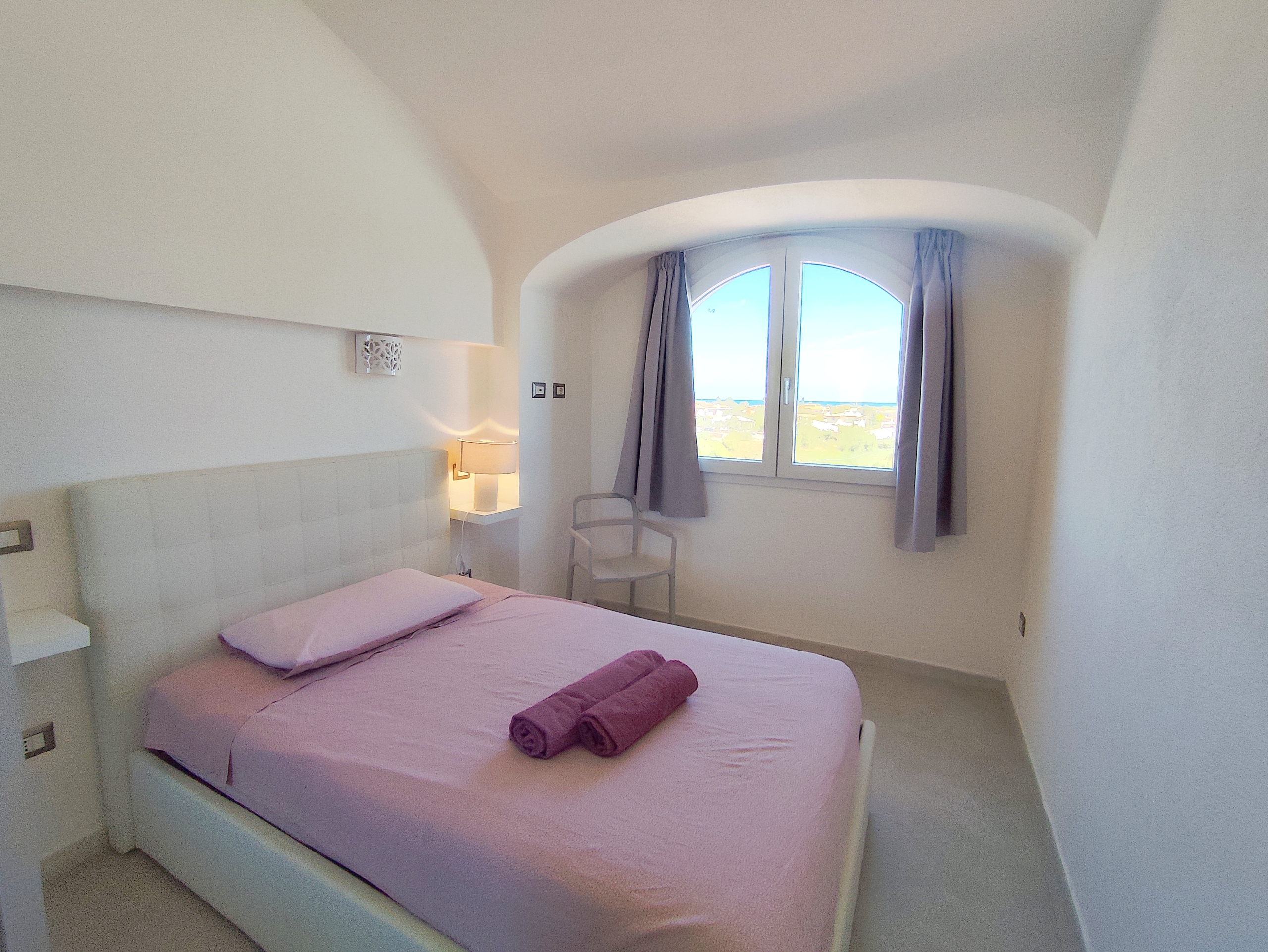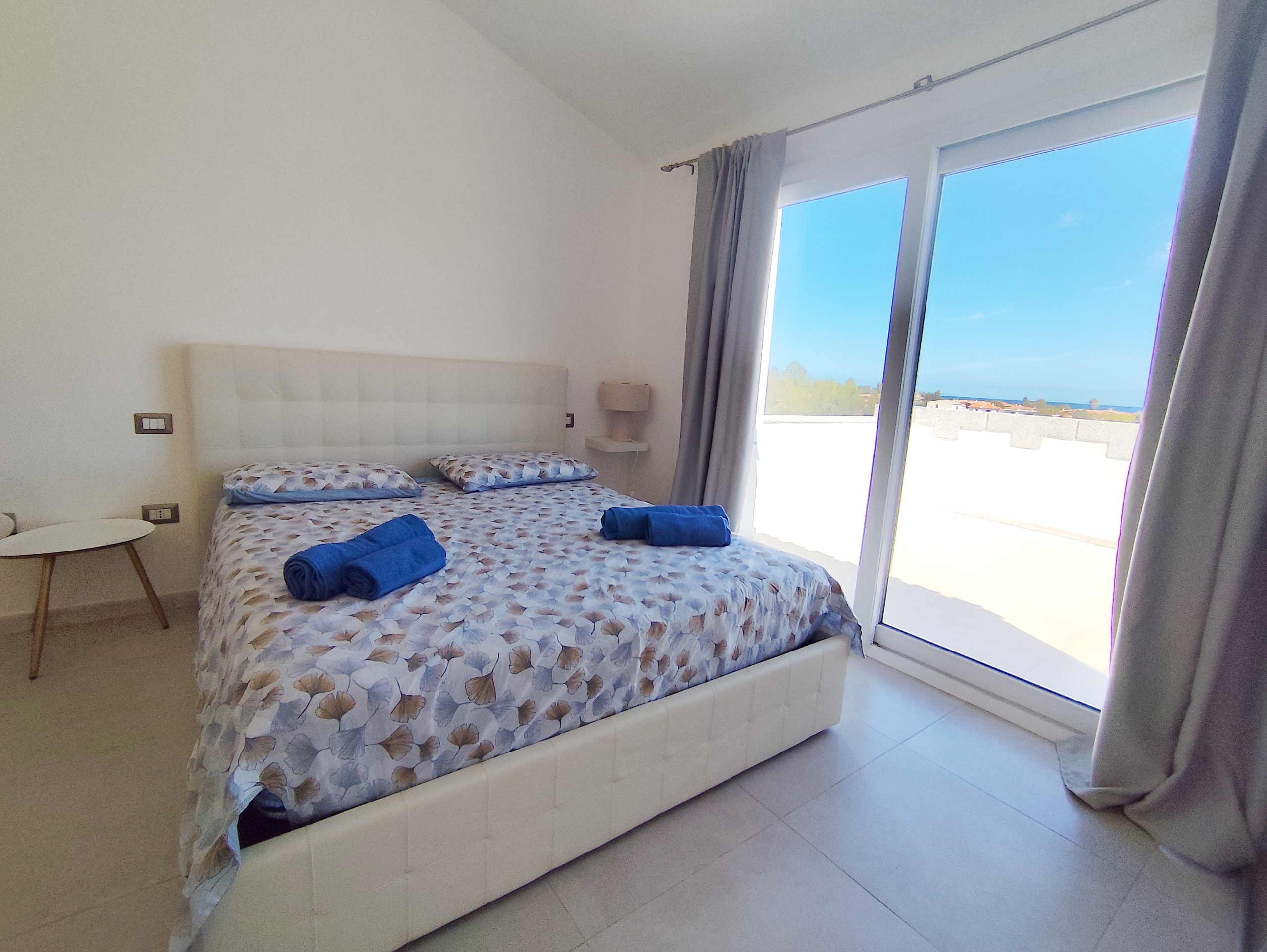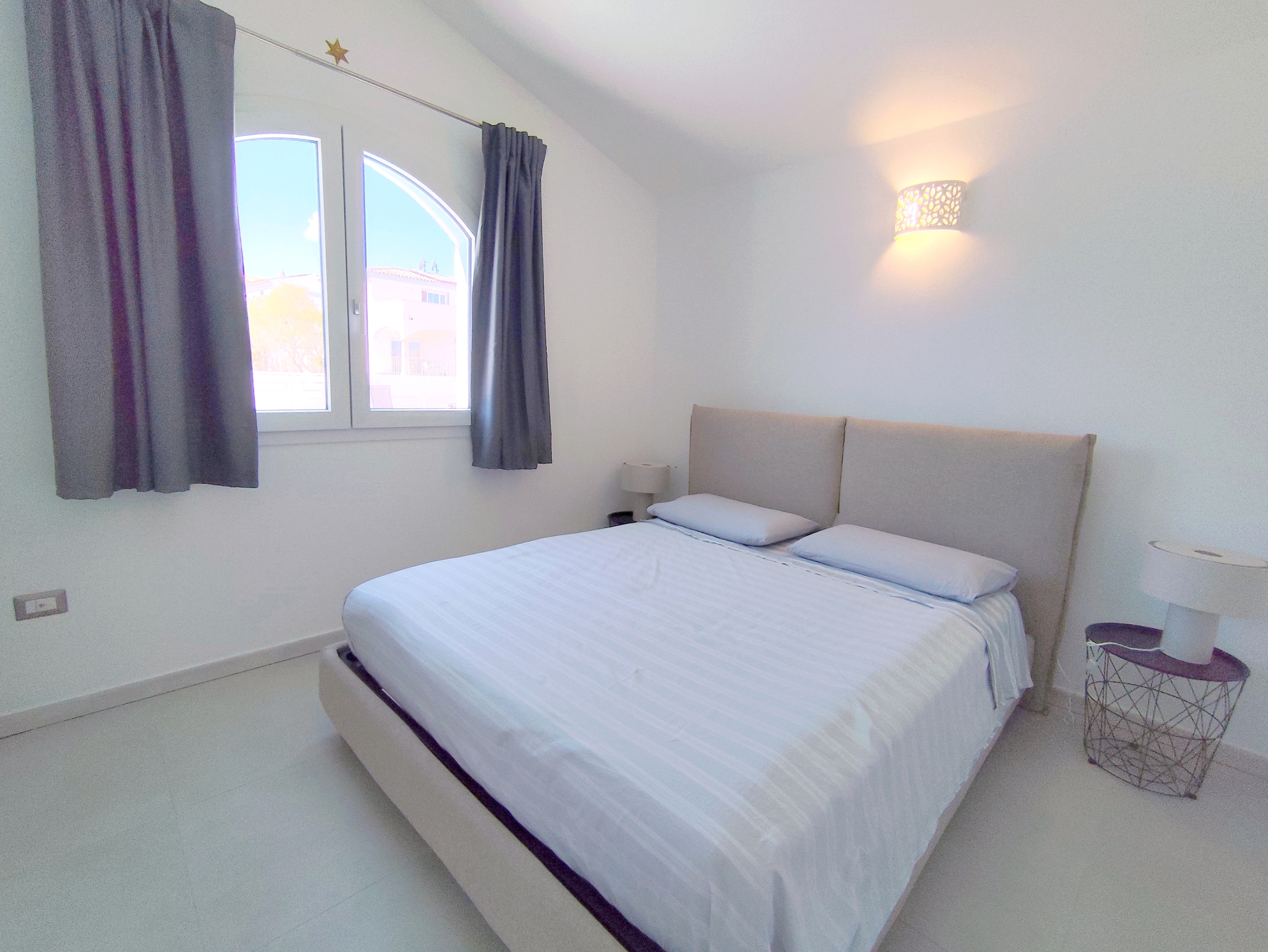 Al piano terra troviamo un comodo e ampio soggiorno con cucina attrezzata, un grande tavolo da pranzo, Smart TV, una camera matrimoniale con accesso alla piscina e un bagno; al primo piano abbiamo una seconda camera matrimoniale con terrazza vista mare, una camera con un ampio letto singolo, due bagni.